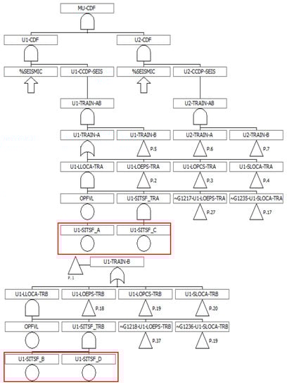 Figure 10 and Figure 11 show MUPSA fault trees for Models A and B, respectively. The intra-unit seismic failures of redundant/identical components in Figure 10 can be simplified to one seismic failure in Figure 11 by applying the full correlation assumption to correlated seismic failures of redundant/identical components. For example, the four seismic failures U1-SITSF_A, U1-SITSF_B, U1-SITSF_C, and U1-SITSF_D in Figure 10 can be simplified to one seismic failure, namely U1-SITSF, in Figure 11 by this full correlation assumption. Similarly, the four seismic failures U2-SITSF_A, U2-SITSF_B, U2-SITSF_C, and U2-SITSF_D can be simplified to one seismic failure, U2-SITSF. As listed in Table 4, 11 groups of correlated seismic failures in Model A were simplified to 11 seismic failures for each NPP in Model B.
