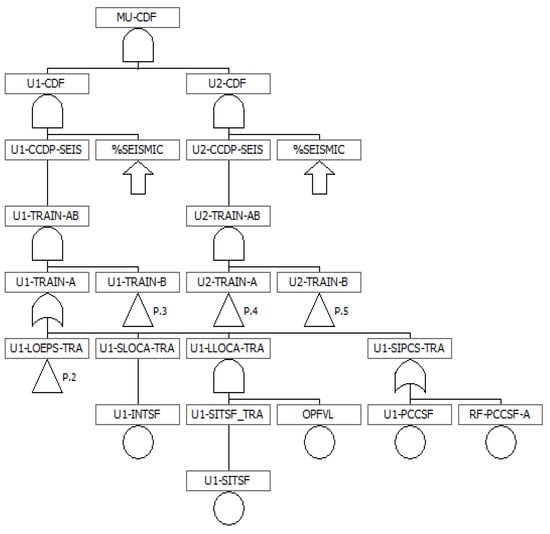 The objectives were very difficult to achieve since the seismic MUPSA fault tree has both intra-unit and inter-unit correlated seismic failures of redundant/identical components. Furthermore, MVN integration is impossible when correlated seismic failures are located under different logical gates in the SUPSA or MUPSA fault tree. Therefore, the correlated seismic failures were converted into seismic CCFs using the COREX tool [23], as explained in Section 3.1. The correlated seismic failures in Figure 2 and Figure 4 were converted into seismic CCFs in Figure 5 and Figure 6, respectively. The SUCDF, SCDF, and MUCDF could then be easily calculated using the same techniques and tools used in the internal PSA.
