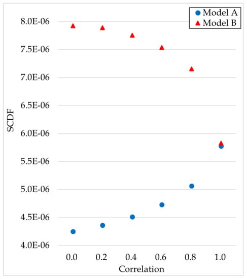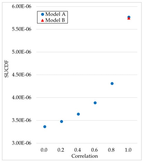 Figure 12 was calculated by multiplying the SUCCDPs in Figure 13 and the mean seismic frequencies in Table 5 and summing the products. Since the AND combination probability increased with the correlation, as explained in Equation (3), the SUCDF of Model A increased with the correlation level. As shown in Figure 12, Models A and B yielded conservative SUCDFs for the full correlation assumption.