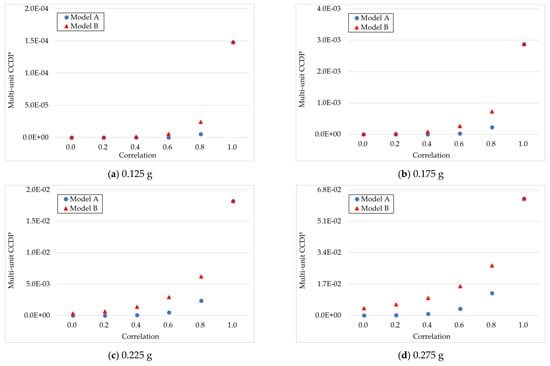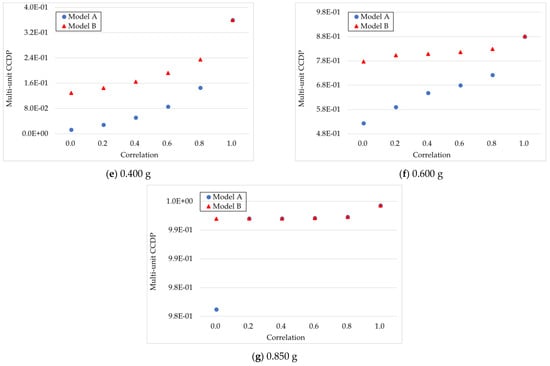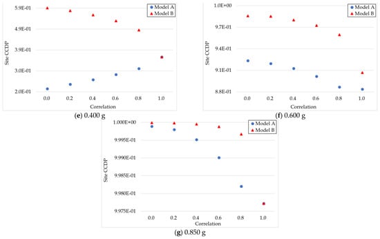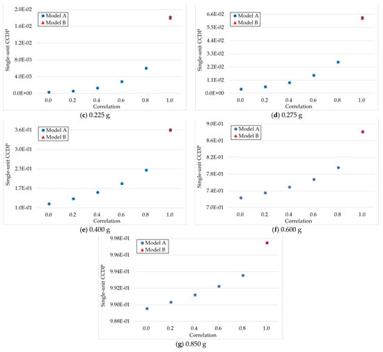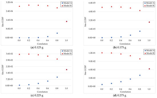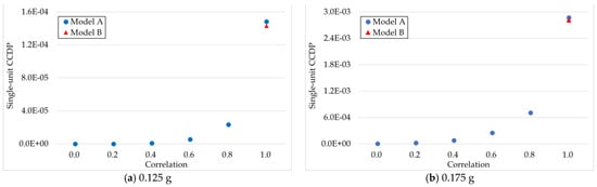 As shown in Figure 16 and Figure 17, the SCDF and SCCDPs of Models A and B for all ground accelerations in Table 5 are compared. The SCDF and SCCDPs are calculated by increasing the correlation level among intra-unit and inter-unit seismic failures of redundant/identical components in Table 4.