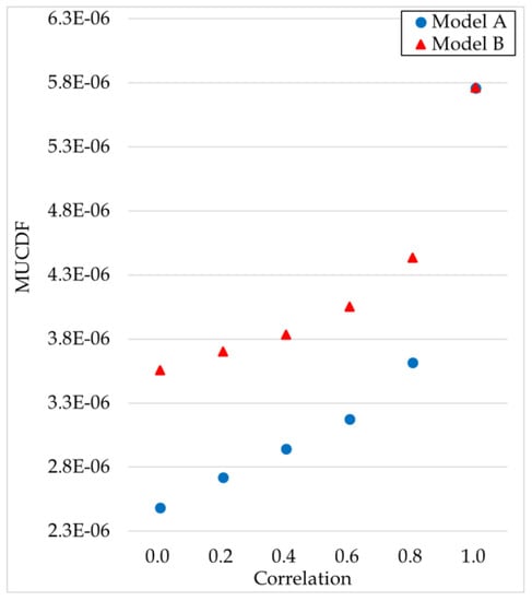 The MUCDFs in Figure 14 were calculated by multiplying the MUCCDPs in Figure 15 and the mean seismic frequencies in Table 5 and summing the products. The MUCDFs of both Models A and B increased with the correlation level among the seismic failures of redundant/identical components, and the MUCDFs of both models were redundant/identical in the case of full correlation. The full correlation assumption resulted in conservative MUCDFs of Models A and B. However, Model A is recommended for the best-estimate calculation of MUCDF in all correlation ranges.
