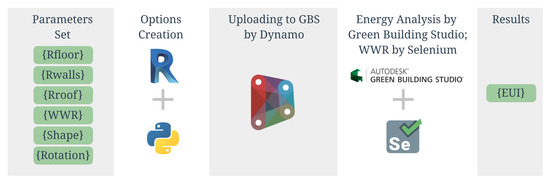 With the aim to build a framework that automates design options creation for energy analysis, a relevant dataset had to be built as a first step. At the first stage, for energy analysis, the following parameters of a building were accounted for: window-to-wall ratio (WWR), shape of the building, rotation in plan, thermal characteristics of elements such as floor, walls and roof. Each parameter had a certain range of variations, thus for a complete analysis, each combination was considered. The general workflow of this step is presented in Figure 1: