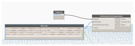 At the third stage, to conduct energy analyses of this collection of data, these gbXML files were uploaded to Autodesk Green Building Studio using Dynamo, which is a part of the out of the box Revit and is a visual programming tool. The Dynamo package used was “Energy Analysis for Dynamo” [35], which requires a list of gbXML files created earlier, and a Green Building Studio project ID, specified in the ProjectID node on Figure 2. The ID can be found using GetProjectsList node from the package, given that a Green Building Studio project has already been created. Other than that, for Revit to be able to recognize the user, one must have logged in in the Revit environment with valid Autodesk credentials.