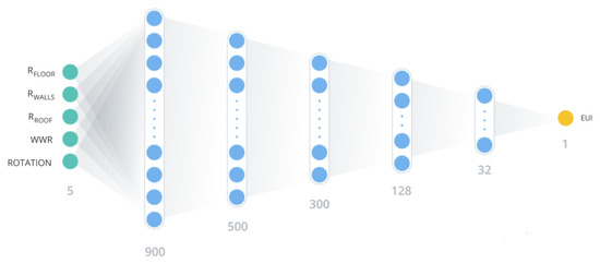 Main principles of ANNs were explained in the previous section. The implemented ANN had the architecture shown in Figure 3, and it was built using Keras framework [36]. The green circles represent the input factors expressed in numbers, and the yellow circle is the EUI value in output. Each blue circle is a single neuron. The ANN had five hidden layers with 900, 500, 300, 128 and 32 neurons respectively.