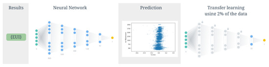 Usually, out of a dataset, a big amount of available data was used for training, and small fractions—for validating, i.e., some data points were left out of training process intentionally to check how good or bad the predictions based on part of the data were. However, if an ANN trained for a similar task was available, then so-called transfer learning could be applied. Transfer learning is a technique allowing to use already trained neural network and retrain it for a new dataset. This is feasible because an already trained ANN ‘knows’ how each input influences the outcome, therefore it knows general patterns. Therefore, if a new dataset represents about the same distribution as the one for which the existing ANN is trained, then with minor shifts of weights it is possible to make the ANN fit the new data. The main benefits of using this technique is that it takes less time and data to train an ANN built on other ANNs. In fact, being able to apply transfer learning has been the key consideration behind this particular choice of ML technique. Based on this reasoning, workflow depicted on Figure 4 emerges: