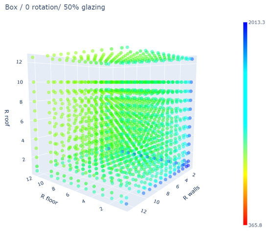 The cube in Figure 5 is identified by 1728 points where each point represents a single combination of thermal resistance of walls, roof, and floor of a Revit model. In particular, it refers to the Box A model results with 50% WWR and 0° rotation. Points are coloured on the basis of the correspondent obtained EUI and the EUI scale beside the cube is common for all the cubes obtainable with Box A setup. As a preliminary and qualitative assessment, such a plot revealed that among all the alternatives of the Box A model, energy demand had a range of about 365-2010 EUI. This meant that the worst configuration demands about 5.5 more energy if compared with the best one. In the provided example, no red points were present (lowest EUI of the scalebar), immediately leading to state that the best configuration could not be found with 50% WWR and 0° rotation for Box A model. Further, although it was obvious that opposite results were obtained along the edges of the cubes with lowest/highest values of , and , by navigating within the cube the designer could easily check the impact of tuning the thickness (therefore the R value) of one or two components. Although the presented qualitative analysis was out of the scope of the presented research, it described one of the possible practical applications exploiting a large number of available processed design alternatives.