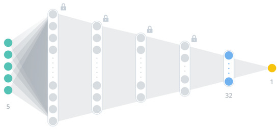 Following the methodology and architecture described above, the NN was trained using data of the Box A Revit model: 93.75% for training, and 6.25% for validation. After training was completed, the ANN knew main patterns in the data, and how inputs influenced the output. With this just trained ANN, a use could be made of the rest of the data obtained from Prism B and Prism C models to put in evidence low amount of effort needed to predict their EUI. For this, Transfer Learning (TL) technique was applied: in just trained NN, four largest layers were frozen (their weights were set as non-trainable), and the rest of the weights were retrained using only 6.25% of available data for training, as shown in Figure 6.