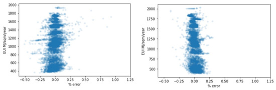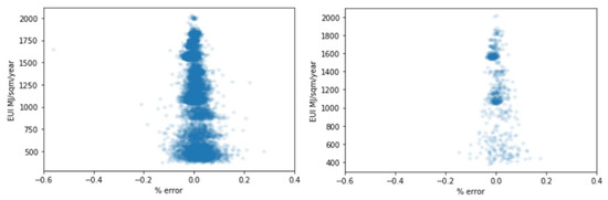 Predicted EUI values for training set on the left side and validation set on the right side. Each point represents an EUI value for a certain combination of the input parameters.