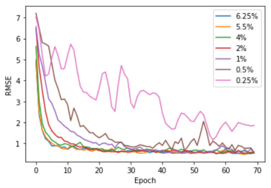 This point was further investigated testing the amount of Box A model data needed for applying transfer learning technique to Prism C model without loosing accuracy. For this purpose, a different amount of the available data was used for training: 5.5%, 4%, 2%, 1%, 0.5% and 0.25%. As one can see in Figure 9, the performance started degrading at about 1–2% of the available training dataset. This amount of points (approximately 150) could be obtained several times faster than the original 10,368 data points, thus taking about 10–20 min for the whole procedure if automated.