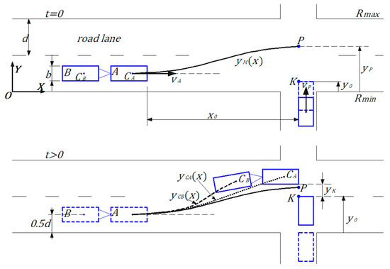 The participation of autonomous motor vehicles in the road traffic may be described with using a few elementary vehicle trajectory models: following of the preceding vehicle, following-up of predesigned reference models, and driving to follow up models that would represent the planned (theoretical) vehicle trajectory [5,6,17]. The design of such models is based on analyses of specific traffic situations and the most frequent drivers’ behaviors [18,19]. This is of critical importance for the safe operation of autonomous vehicles in the road traffic where cars driven by human drivers will remain predominate for many upcoming years.