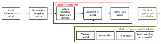 The addition of a trailer to the autonomous vehicle will result in better economic and energy efficiency of the transport processes. However, this will also bring about a change in the dynamic properties of the CT unit compared with those of the motor vehicle alone. The presence of a trailer radically affects the dynamics of the towing vehicle and reduces the stability of the vehicle combination as a whole. An extensive review of such research works on CT units has been presented in [13,14]. The attaching of a trailer to a motor vehicle may also cause oscillations of the CT unit in the final phase of the obstacle avoidance process (in the initial phase, the trajectories of both vehicles are almost identical). This can be observed, e.g., in the profile of the trajectory of the CT unit’s center of gravity (CG) for rising vehicles’ yaw angles from the carriageway centerline [15]. The research on the stability of CT unit’s motion, reported in [13,14], has shown that the instabilities occurring in the trailer and vehicle’s motion strongly depend on the mass and moment of inertia of the vehicles and on the drawbar length. Experimental research on the stability of a car-trailer unit within a sped range of 48–90 km/h, with a rapid turn of the steering wheel, has confirmed decisive impact of the parameters mentioned above on the behaviour of the vehicle combination [16]. These findings have been taken into account in the modelling described hereafter. The controlling of a motorcar-trailer unit is a far more complex issue in comparison with the controlling of a motor vehicle alone [15]. The values and ranges of the input parameters applied to the control system model must be different as well.