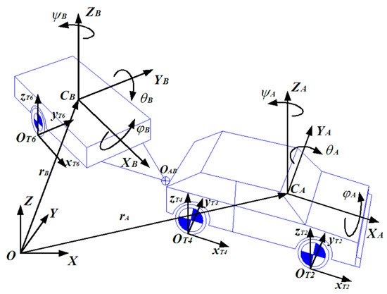 - —local coordinate systems {}, each having its origin at the centre of the tyre-road contact area of the th wheel ( = 1, 2, …, 6; 4 vehicle wheels and 2 trailer wheels, the latter being assumed as twin wheels).
