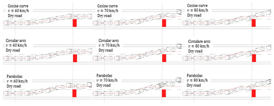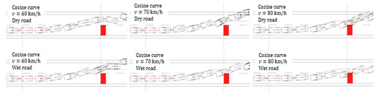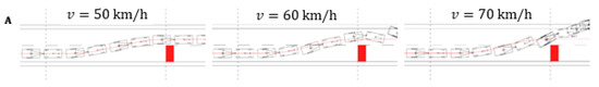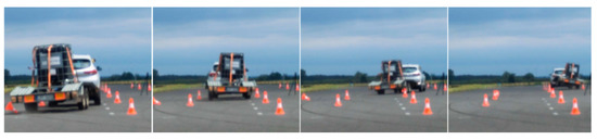 If a collision took place between the CT unit and the obstacle contour or the CT unit found itself outside of the road (i.e., outside of the carriageway and the road shoulder) or overturned, such a test result was considered as a “collision with the obstacle” or maneuver failure. The test results have been presented in a synthetic form in Figure 22 and Figure 23 and the clearance margin () values used to plan the safe trajectory are specified in Table 3.