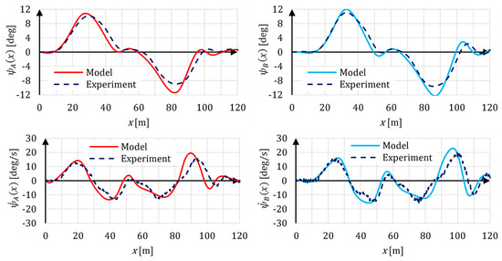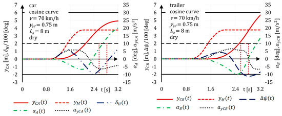 - lateral accelerations of the towing vehicle and the trailer, and , observed within the road section, declined from 5.0–6.1 m/s2 to 4.4–5.1 m/s2, respectively;