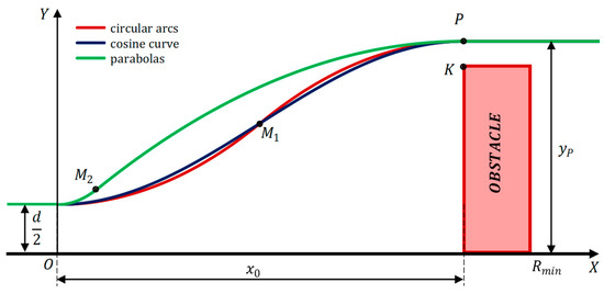 Regardless of the driving model chosen, autonomous vehicles move to follow up a pre-planned trajectory. This is also the case when the obstacle avoidance takes place. A critical review of the trajectory planning methods has been presented, e.g., in [1,11]. The trajectory planning is based on determining the curve that describes the lateral displacement of the center of vehicle mass (e.g., when the vehicle changes the lane to the adjacent one) in the form of algebraic equations, which may represent sequences of circular arcs, polynomial splines, clothoid splines, Bézier curves, etc. [1,5,9,20]. When the desired vehicle trajectory is determined, it is important that the basic limitations dictated by the properties of real cars and road surface should be taken into account [21]. As an example, a method of generating the vehicle trajectory has been presented in [8], where the maximum acceptable values of the lateral (centripetal) acceleration of the car were taken into account. In the work reported in [9], the vehicle trajectories and their curvatures were planned taking into account the comfort of vehicle occupants, e.g., a requirement was adopted that the lateral acceleration should not exceed 1.6 m/s2 (the limit for good comfort) or 3.6 m/s2 (the limit for medium occupant’s comfort). In the vehicle control system, calculations are carried out to plan the desired vehicle trajectory and to track the actual one. As another option, a controller provided with a library of pre-programmed solutions suitable for plannable situations may be used [12]. An example of planning a trajectory for a safe lane-change and obstacle avoidance maneuver, taking into account the current traffic situation and the dynamic properties of the CT unit, is shown in [10]. In the vehicle control process, the goal is to minimize the distance between the current position of the center of vehicle mass and the planned vehicle trajectory, and to minimize the difference between the angular positions of the longitudinal vehicle axis and the tangent to the said trajectory [22,23,24].
