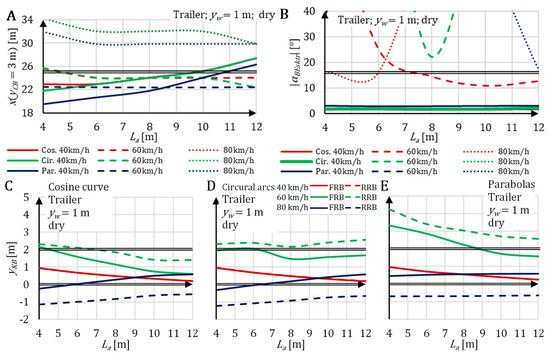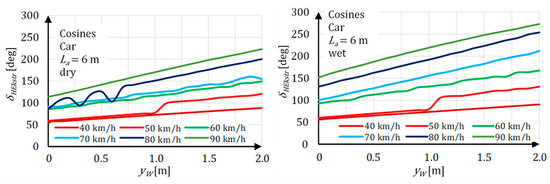 The tests represented in Figure 19 have confirmed that the applying of low values when planning the obstacle-avoiding trajectory would be well justified, but within a limited range of vehicle speeds (especially on wet road surface). This information was gained after the tests were extended to a vehicle speed range of = 40–90 km/h.