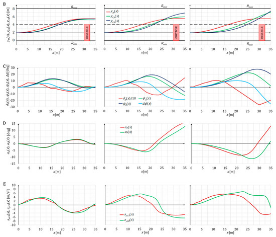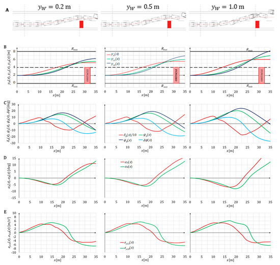 The angle corresponds to a signal generated by the control system (Figure 3). Its values at the first extremum have been shown in Figure 21. During the initial part of the obstacle avoidance maneuver (), they should steeply rise so that the CT unit would be able to follow the path with the curvature as planned. Such an effect may be obtained if a big distance margin is adopted. With this objective in view, high clearance margin values should be used when planning the trajectory . However, it is not easy to make the CT unit avoid the obstacle this way at as low speeds as > 60 km/h because of high values of lateral acceleration , lateral force , and tire sideslip (Figure 18D and Figure 19D), which increase the distances between the vehicle paths ( and ) and the trajectory planned () (Figure 21B for = 70 km/h). This highlights one more of the dilemmas to be resolved when selecting the values.