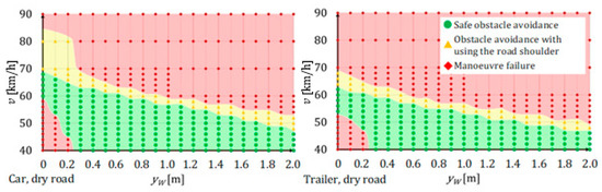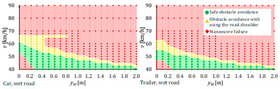 The area of acceptable selection of the values, as plotted in Figure 22, shows that a motorcar in a CT unit moving on dry road surface would be able to avoid the obstacle even if travelling with a speed of up to 68 km/h, while the trailer towed by it would safely avoid the obstacle only if its speed did not exceed 62 km/h. If the road surface is wet (see Figure 23), a safe obstacle avoidance would only be possible if the CT unit’s speed were limited to 54 km/h. Assuming the acceptability of using the road shoulder (up to 1 m wide) in the critical situation, the obstacle would be avoided if the vehicle speed were up to 68 km/h on dry road surface and up to 62 km/h on the wet road surface (see Table 3).