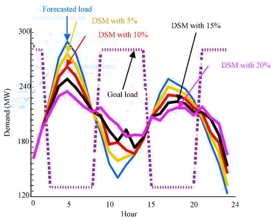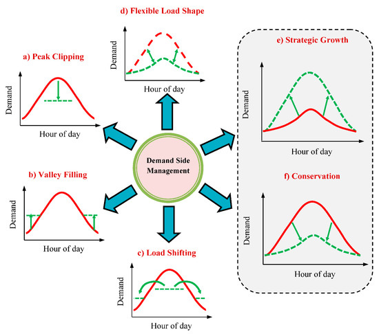 The strategies of DSM mostly are needed for public facilities in order to grow their economics and develop a demand shape. Typically, companies of public industry have interesting DSM methods for encouraging the higher incorporation of consumers. Therefore, the public industry companies could easily succeed in reaching their aims. According to recent papers that address the DSM problem, the clipping of peak, filling the path, load shifting, strategic consideration, growth of strategic demand, and supple load curve are considered as the six main approaches []. The first three approaches are basic levels and the others are innovative methods that monitor the total load curve by either limiting or extending.