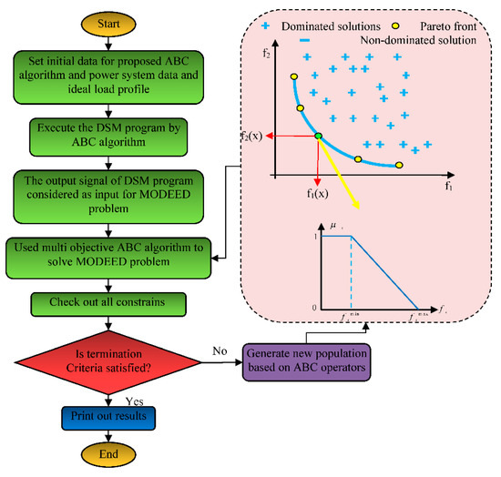 The rest of this paper is organized as follows. Section 2 explains the formulation of the DEED problem and DSM. The suggested integrated method is presented in Section 3. Section 4 presented the suggested improved multi-objective artificial bee colony algorithm. In Section 5, some different test systems are presented. The numerical analysis and their comparisons are presented in Section 6. At the last section, the conclusion is presented.