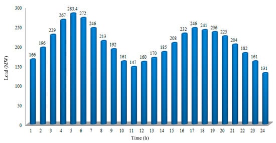 In this article, the six thermal units considered as the case study are considered in different scenarios. The fuel cost coefficient of a generator, emission coefficient, the bound of the ramp rate, the predicted load demand profile for 24, and other corresponding system data can be found in [,,], and for the reader’s convenience, they are presented in Table 1 and Figure 4. As presented in this figure, the first unit production is higher than the other units. The matrix of transmission loss constant of the six studied system units is shown in Equation (35). In total, the demand of each network is a combination of domestic, commercial, and industrial demands. The residential area has several controllable domestic devices such as a dish washing machine, washing machine, kettle, oven, and other domestic devices that could be simply managed during the demand shifting approach in comparison with other industrial and commercials demands. Hence, only the demand shift technique of DSM based on the next day is implemented for residential loads. During the implementation process of DSM, four cooperating levels with 5%, 10%, 15%, and 20% of the whole habitable demand are evaluated. The electrical prices of the market are dedicated for total public facilities in each hour with the ToU tariff. In the mentioned test, the utilization of total controllable domestic devices is considered 2 kW, but their pattern of electricity consumption is different. In the mentioned model, the maximized late steps of every controllable device based on their consumption lifestyle are dedicated. For example, two or three maximized delayed steps for necessary devices such as a kettle, oven, and hair dryer are evaluated in this work. In same approach, 12 maximum of delayed steps for less necessary devices such as a cloth dryer, iron, and vacuum cleaner are considered.