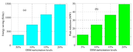 The main aim of this paper is analyzing the effects of DSM evaluation on the production side. Thus, the DSM is evaluated by minimization of the public electricity bill as the basic goal. Figure 5 presents the predicted load shape and the load curves after implementation of DSM with different levels of residential cooperation. It is obvious that an improved demand curve for higher cooperator levels is achieved. The public industry company has achieved interesting advantages, and this is because of the DSM evaluation that is presented in Figure 6a,b. By the obtained results of the DSM problem, the daily frugality of energy bills of the public industry company for participation levels are 5%, 10%, 15%, and 20% from those whole inhabitant demand are $363, $731, $1950, and $1457, respectively. Similarly, the peak load demand also for different levels of participation is 12.32, 24.32, 36.12, and 49.01 MW, respectively.