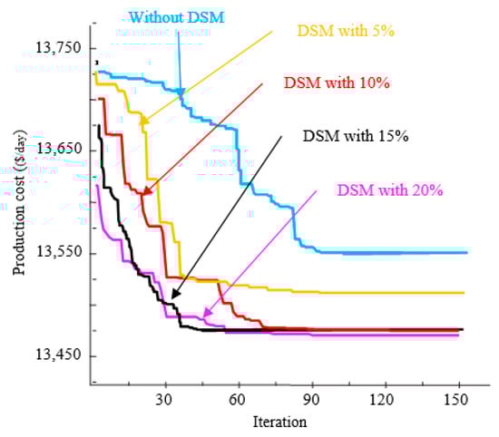 The single dynamic economic dispatch is considered here as the first test case by considering the DSM effects over a fuel cell. For qualitative study, four different levels of participation are presented in DSM. In this approach, dynamic economic dispatch and DSM have been minimized simultaneity based on the suggested approach. The obtained numerical results are presented in Table 2 by including/excluding the DSM. Figure 7 demonstrates the convergence issues of DEED optimization including/excluding DSM. Results demonstrate the useful effects of DSM on electricity production through decreasing their fuel costs. In addition, it shows that the quantity of fuel production cost is minimized in different participation levels of DSM. For instance, DSM with the participation level of 20% has about a 7.5% drop in daily fuel cost in compared to the condition without DSM. Production companies can save a daily fuel cost equal to $91.5, and this frugality is the result of DSM implementation.