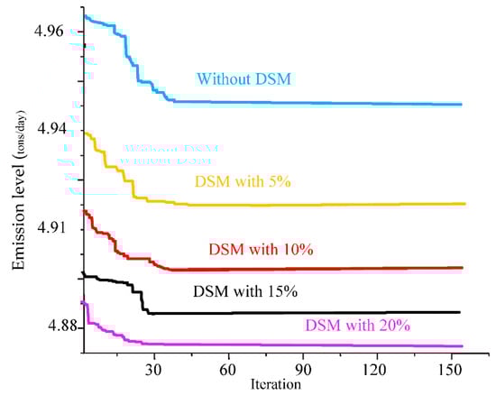 The convergence features of dynamic emission dispatch by different levels of DSM participation.