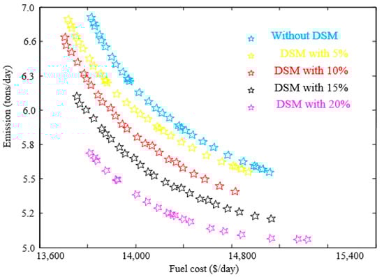 The DEED model by considering the DSM is considered in this test case through the MOABS algorithm. The obtained numerical analysis is presented in Figure 9 based on MODEED by considering various levels of DSM participation. In addition, Figure 10 shows the set of different Pareto values with different levels of DSM participation. The finest adaptive quantity of fuel cost and distribution using the fuzzy membership approach is found.