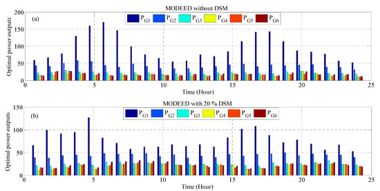 The output of optimized electricity of 24 h of generators, (a) in the present of DSM and (b) in the absence of DSM.