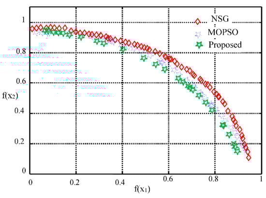 If n = 30, the problem of non-dominated Pareto front will be 219 in the regional Pareto front. To compare the proposed algorithm, consider two powerful MOPSO and NSGA-I algorithms with the same initial conditions such as the number of populations at 100 and a maximum iteration of 1000. The best Pareto distribution for the proposed MOABC is arrived after 350, while this number for NSGA-I is 650, and for MOPSO, it is about 1000 iterations. The final Pareto solutions are shown in Figure 12. Figure 12 shows that the superiority of scattering solution points (Pareto front) is achieved through the proposed algorithm compared to the NSGA and MOPSO models.