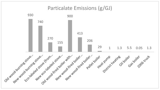 For each solid fuel appliance, the standard MSZ EN 303-5 defines clear requirements in terms of efficiency and emissions (among other requirements), but the fulfillment of these parameters is true when determined, specific laboratory conditions, professional operation, and last but not least, strict fuel quality requirements are provided and met. This follows from the socio–economic and infrastructural dependence mentioned above that the emissions from solid fuels mainly depend on the operating equipment and the quality of the fuel burned in the equipment. Based on Danish data from 2016, the specific particulate emissions of some heating modes are shown in Figure 1.
