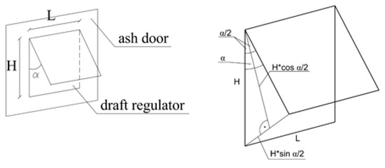 Different operations were performed for the cases without a working draft regulator (temperature controller) and without a draft regulator with different fixed draft door settings, and the effect of different fuel loads was also measured for fixed primary air supply cases. In the various measurement studies the cases according to Table 3 were performed. In order to clearly define the opening of the draft control door of the device, a flow rate must be determined, which can be determined from the quotient of the free-flow cross section resulting from the opening of the door and the nominal free cross section, as shown in Figure 2. Figure 3 shows a schematic arrangement of the measuring station.