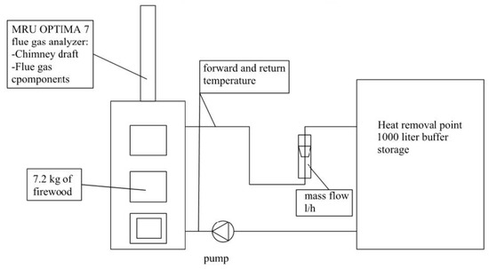 Prior to the actual measurements, a load was burned in the boiler to eliminate the errors from the cold start, to form suitable embers, and to warm up our system to operating temperature [10]. Our examined system operated on the basis of the arrangement shown in Figure 2. After preheating, 7.2 kg of fuel was uniformly loaded through the firebox door shown in the figure. During the tests, the total combustion period of the loaded fuel was monitored in each case. The measured parameters are shown in Table 2.