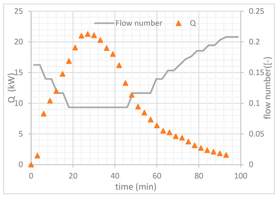 In Figure 4 and Figure 5, it can be observed that the automatic draft control door continuously reduces the flow rate in parallel with the increase in power (Q), and at the same time the CO emission also increases. As it can be observed, under the construction firing stage, Q increases, but CO decreases. At this interval, the system approaches the perfect combustion process, but at the same time, it reaches the set maximum temperature, which causes the draft regulator to close. When the load in the firebox enters the declining section, the control device begins to open the primary air door to maintain the temperature set on the draft regulator. The minimum flow rate of almost 25 min is due to the fact that, due to safe operation, a minimum amount of combustion air must be provided even in the event of a complete shutdown, which means a flow rate of 0.093 in this case. It can also be observed that in the initial, developing phase of combustion, the instantaneous CO emissions increase sharply at the same time as the draft control door is closed. For the entire firing time interval, the average CO emission was 5973 ppm, which is more than 1600 ppm higher than the limit allowed by the standard.