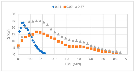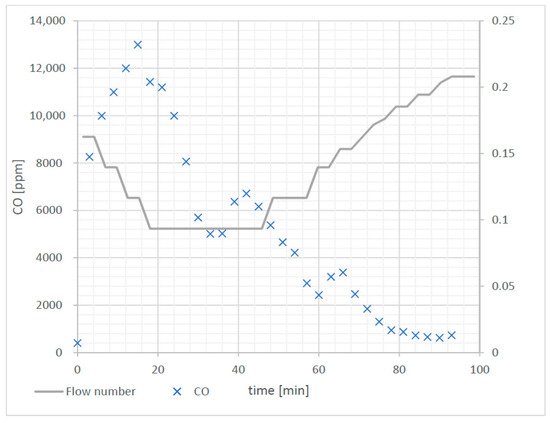 It can be clearly seen from Figure 6 that with a constant high-flow rate, the firing process takes place in a short time, and the developing phase is followed by a rapid declining phase. In the case of an intermediate flow rate, the burn-out time increased by almost one hour, and the developing phase was characterized by a nearly constant peak power lasting 10 min. The declining phase was prolonged in time. With a low flow rate, the burn-out time also lengthens, but the maximum recoverable power is well below the value of the previous setting parameter. Compared to the recoverable power of Figure 4, the maximum recovered power was also higher. Figure 7 shows the carbon monoxide emission values for the entire combustion stage at the flow rates described above.
