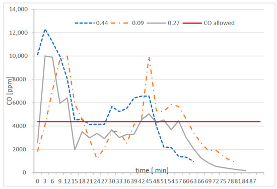 The solid horizontal line indicates the permissible CO emission value according to the MSZ EN 303-5 standard. It can be observed that at the highest flow rate, the equipment operates above the permissible emission limit for almost the entire firing time. The air inlet resistance of the appliance is the lowest in this case, so the temperature of the flue gas, and at the same time, the draft in the chimney increase due to the rising temperature of the firebox. As a result of the combined effect of these phenomena, the amount of combustion air entering the firebox exceeds the amount required for ideal combustion, which results in poorer quality combustion and thus higher CO emissions. In the case of an intermediate draft control door position, a monotonically increasing CO evolution is observed in the developing phase of the firebox; however, after the maximum output and ideal combustion at this preset, CO formation drops drastically and briefly exceeds the standard limit in the burnout phase. At the lowest flow rate, the CO emission takes on a similar character to the previous setting value, but higher carbon monoxide emission values are typically observed over the time of total combustion.