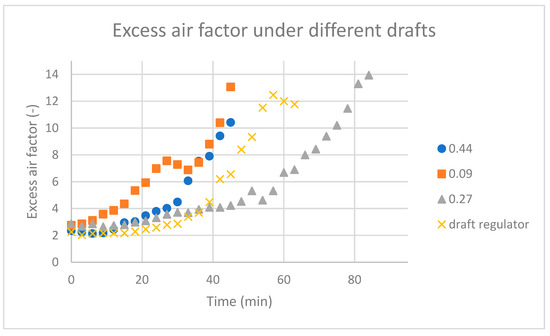 In the case of Figure 8, the excess air factor can be observed under different drafts, and in the case of the draft regulator door. At 0.27 flow rates, it is experienced for the longest time, a nearly constant value, for which the control also reflects other parameters of firing. At 0.09 and 0.44, the excess air factor values rise steeply, reflecting rapid burnout and a 21% increase in oxygen levels.