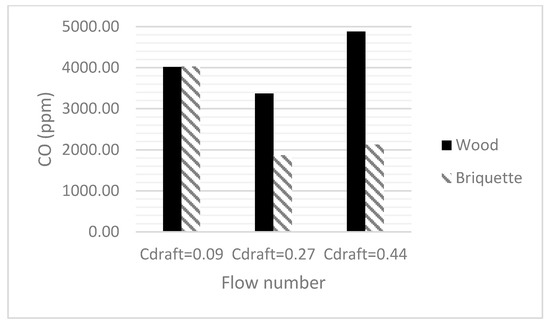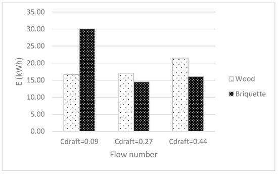 It can be observed that when burning with briquette fuel, the CO emissions can meet the maximum permissible average carbon monoxide emission limit value indicated by the dashed line at any preset value. In the case of briquettes, we obtained the lowest emission value with a flow rate of 0.27, which is almost half of the value compared to log firing. However, in the case of wood burning, the average energy yield is 17.1 kWh, compared to 14.5 kWh obtained for briquettes. However, in the case of briquettes in the operating state belonging to the maximum opening, a higher energy yield of 16.1 kWh was obtained, with a minimum increase in carbon monoxide emissions. An outstanding difference compared to log burning was that in the case of the CO emission limit value that is met even at the lowest flow rate, we achieved almost twice the energy yield in the case of briquettes.