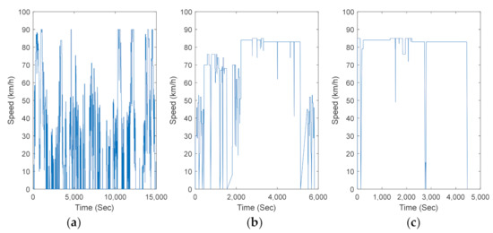 (a) City Distribution drive cycle; (b) Regional Distribution drive cycle; (c) Long-Haul drive cycle.