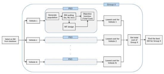 The optimization process that follows for each of the groups is independent, and is based on the work presented in [6]. Every EM geometry (2D) in a previously defined set will be evaluated, and the optimizer will find the optimal machine length and number of turns, together with the PEC rating and the MT to minimize a certain objective function, for each of the vehicle types in the group. Once all machine geometries in the set are evaluated, the one with the lowest total objective function (adding the results obtained for all vehicles) is selected as the best machine for that group. The optimization process for one group is shown in Figure 2, and it is repeated for all groups.