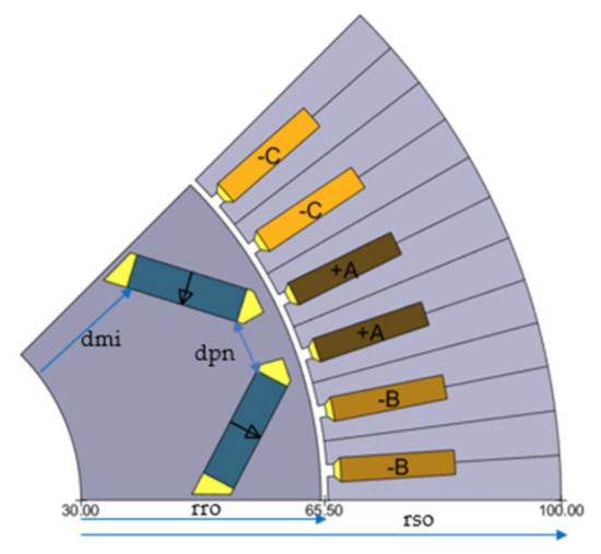 The parameters varied to generate the EM database are the stator outer radius (), the ratio between rotor and stator outer radius (), the number of poles (), the number of slots per pole and phase (q), the ratio between yoke length and slot length (), the distance between v-magnet-slot edge and rotor inner radius (dmi), the distance between the v-magnet-slot edges of the neighbor pole magnets (dpn).