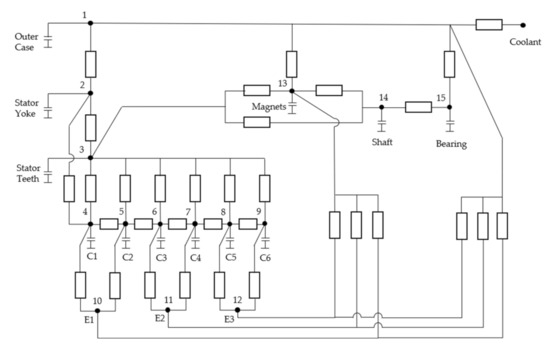 Meanwhile, a lumped parameter thermal model is used to ensure that the thermal constraints are satisfied during the scaling process. Based on this, the overloading factor () is introduced and limits the amount of time that the EM can stay in peak overloading condition. The thermal model used in this paper, shown in Figure 4, is an adaption of the one presented in [5]. The model automatically adjusts itself to any feasible number of conductors per slot. Assuming that there are six conductors in one slot, the thermal model consists of 15 nodes which correspond to the temperature in the outer case, the stator yoke and teeth, the conductors inside the slot and the end turns, the rotor magnets, shaft and bearings. The thermal resistances and capacitances are estimated based on the geometrical parameters [17]. The iron losses for the stator yoke and teeth, the copper losses for each conductor in the slot and each end turn are used as inputs for the corresponding nodes. The maximum allowed winding temperature (150 °C), the coolant temperature (65 °C) and the heat transfer coefficient for the cooling system (600 W/(K)) are common to all machines in the set.