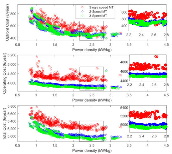 To illustrate the differences among single-speed, 2- and 3-speed transmission, vehicle 4 is taken as an example. The upfront cost, operating cost and total cost of vehicle 4 for each viable EM are shown in Figure 5.