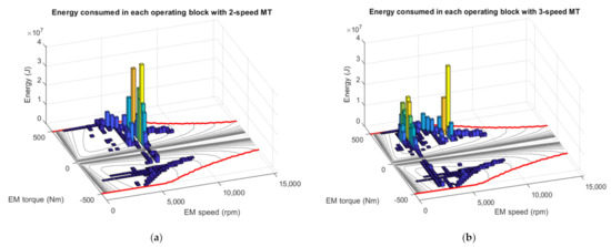 Each bar represents the energy consumed at that specific operating point with a 2-speed MT (a); and with a 3-speed MT (b).