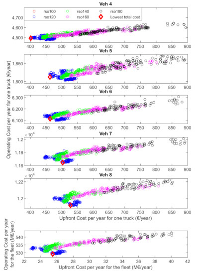 The operating costs vs. the upfront costs for all suitable EM designs for Group B are illustrated in Figure 7. It is clear that the upfront cost of the optimal design for each truck increases from vehicle 4 to 8 because of the increase in power demand. It is also shown that the cheapest machine (lowest upfront cost) is not always the one with the lowest total cost, and the optimizer finds good balance between upfront cost and operating cost.