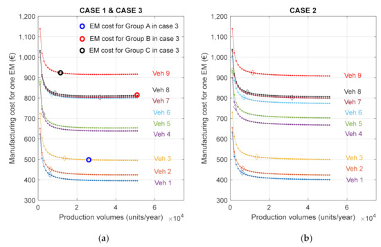 Taking Group B again as an example, Figure 8a shows that the EM cost for case 3 (red circle) is lower than the EM cost of the optimized EM for Vehicles 5, 6 and 8 as they have smaller production volumes (even if Vehicle 8 has the largest EM), but it is higher than the cost of the optimized machines for Vehicles 4 and 7 since the increase in production volume does not compensate for the larger size of the machine. From Figure 8b, it can be seen that sharing the same 2D geometry within a group generally increases the EM cost, with the exception of Vehicle 6, in which the EM cost is reduced but the operating cost probably increases to a larger extent. Sharing the same 2D geometry brings limited production cost benefits, which in most cases do not compensate for the larger size resulting from a suboptimal machine design.