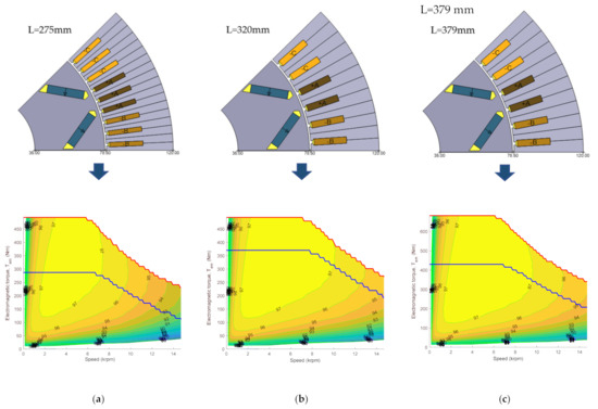 2D EM geometry and the corresponding efficiency map for vehicle 4 in case 1 (a), in case 2 (b) and in case 3 (c).