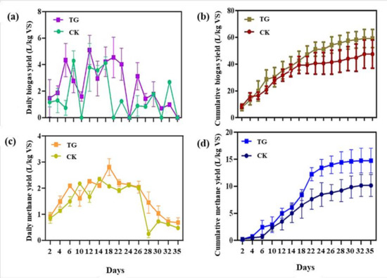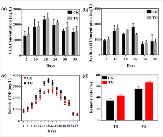 The removal rates of COD, TS, and vs. also can reflect the decomposition and conversion of substrates by microorganisms. These indicators can reveal the utilization rate of substrates and the digestion efficiency. As shown in Figure 2c, the conversion of substrate to biogas was similar to that for VFA and acetic acid. The COD contents of TG and CK reached the peak values on 18D and 22 days (22D), which were 3540 mg/L and 2686 mg/L. These values increased by 74.6% and 71.03% over the initial concentration, respectively. At the end of the digestion period, they decreased by 41.6% and 32.73%, respectively, compared with the initial concentrations. This result is consistent with the results shown above for biogas production. The removal rate of TS and vs. after fermentation in each group is shown in Figure 2d. In terms of TS, the removal rate in TG was 43.11%, while that in CK was 34.33%, and the vs. removal rate was basically consistent with the results of TS; it was 66.59% in TG and 55.16% in CK. Higher TS and vs. removal rates were achieved in TG than in CK, attributed to the higher substrate conversion to biogas/methane (higher VFA and COD concentration and biogas/methane production).