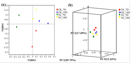 Considering the diversity, the α-diversity showed the same variation tendency as archaea. For Shannon index, it was higher in TG (ranged from 4.00 to 4.20) than in CK, but it decreased in CK (ranged from 3.91 to 3.76) at 7D to 18D (Table 1). This is the reason why strain KA3 promoted the decomposition of substrate and thus improved the hydrolytic bacterial activity. The β-diversity of bacteria was similar to that of archaea (Figure 3b), which showed a significant difference between TG and CK.
